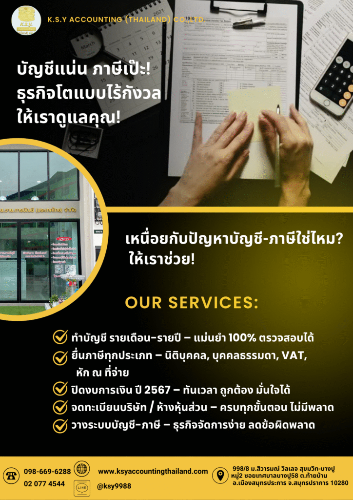 Services 3 ข้อต้องรู้เกี่ยวกับการจดทะเบียนธุรกิจ 06/04/202506/04/2025 Saowani ✅ เลือกให้เหมาะ – บุคคลธรรมดา, หจก., หรือ บจก. ส่งผลต่อภาษีและความรับผิด 📄 เตรียมเอกสารให้พร้อม – ชื่อ, ที่อยู่, บัตรประชาชน, สัญญาเช่า 🧾 หลังจดแล้ว ต้องยื่นภาษีทุกปี – แม้ไม่มีรายได้ก็ต้องยื่น K.S.Y ACCOUNTING บริการครบ จบ ในที่เดียว Related Posts Services โปรโมชั่น เดือนพฤษภาคม 05/27/202505/27/2025 Saowani Services ทำไมต้องเลือก K.S.Y? 05/24/202505/24/2025 Saowani